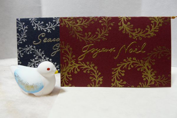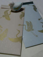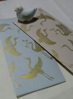 唐紙は買えないけど、はんこなら作れる?と、鶴のはんこを3種類作り、ちょっとだけキラキラする紙に金色で押してみました。