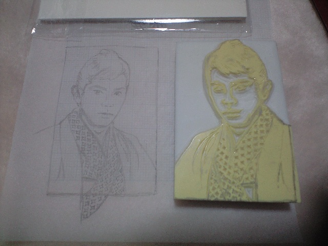 うーむ、人の顔は彫ったことがないので、下絵の段階からやり直したほうが良さそうですが、二回彫る根性はありませんorz